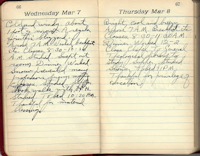 Cold and windy. About 1 foot of snow. A regular winters' blizzard. Arose 7 A.M. Washed, breakfast etc. Classes 8:30-10:30 A.M. Studied. Swept out room. Dinner. Worked. Snow prevented many professors from meeting classes. Studied. Supper. Took walk with H.H. Studied. To bed 10:30 P.M. Thankful for material blessings.